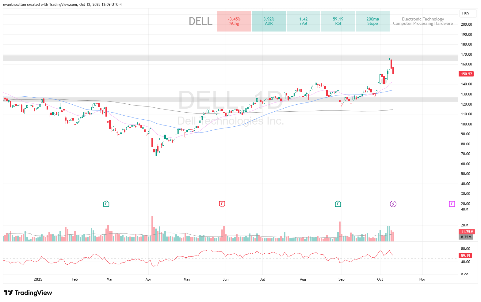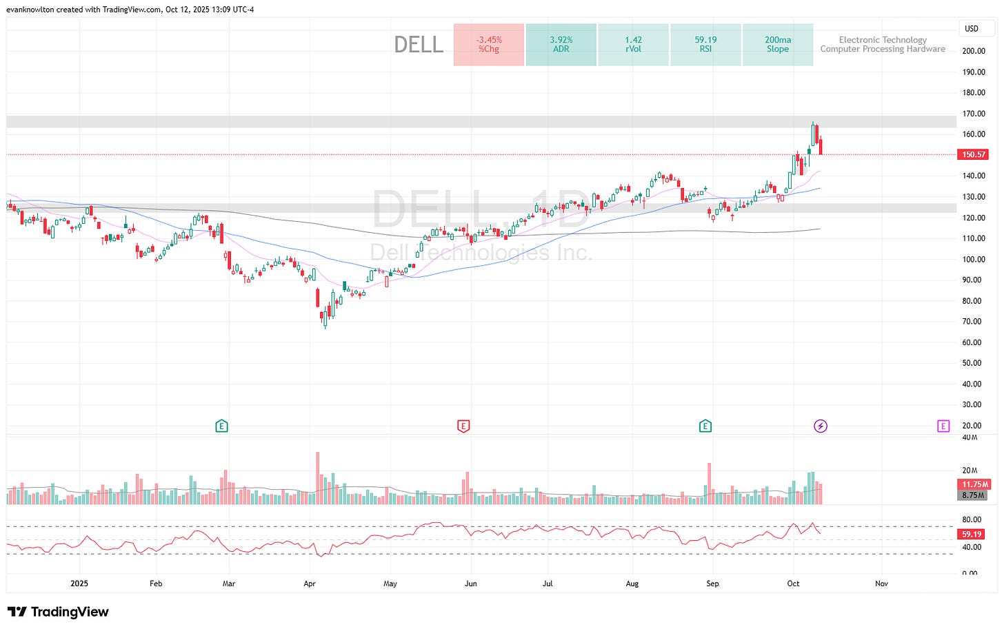 DELL staged a powerful move, notching new 52-week highs Tuesday following positive revenue guidance through 2030, and allowed for quick scaling out at 100% gain before reversing late week.