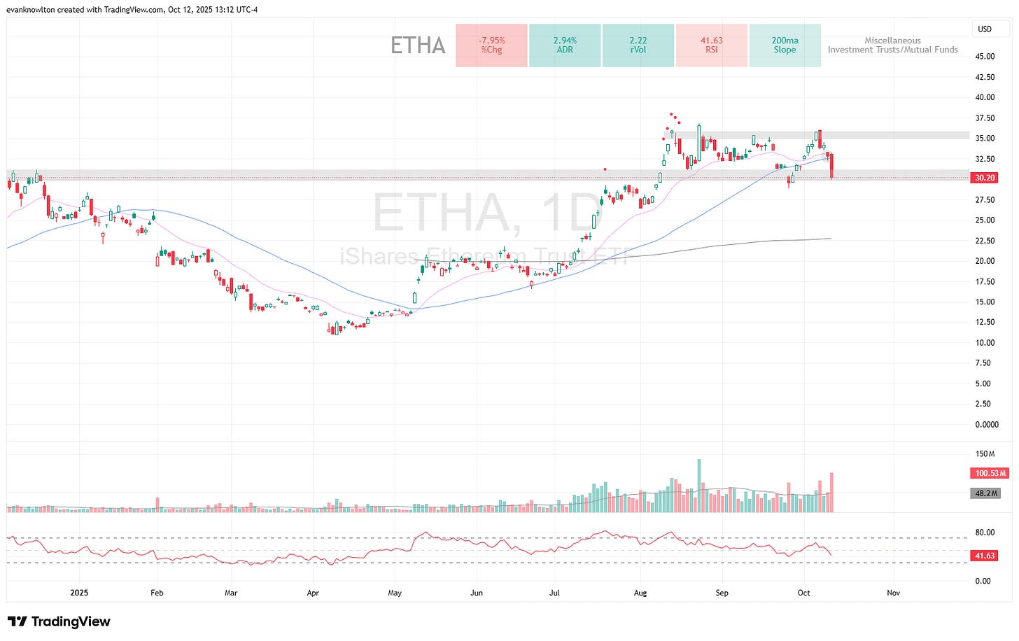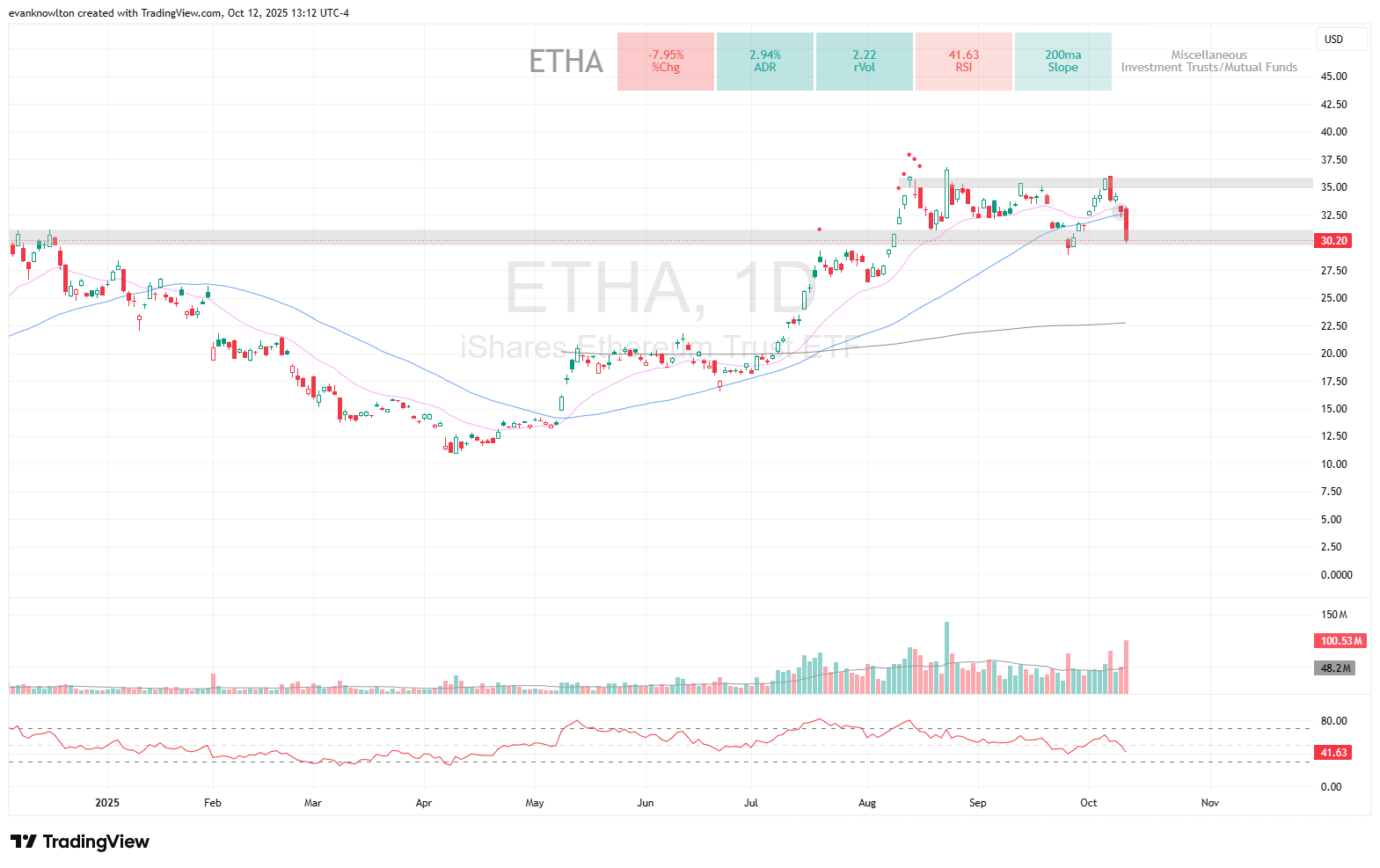 ETHA was added via January contracts around the 20EMA after options cooled, offering a steep entry discount. Depending on Monday’s action, I will close if it can’t get back above the clear support level around $30 after Friday’s selloff.